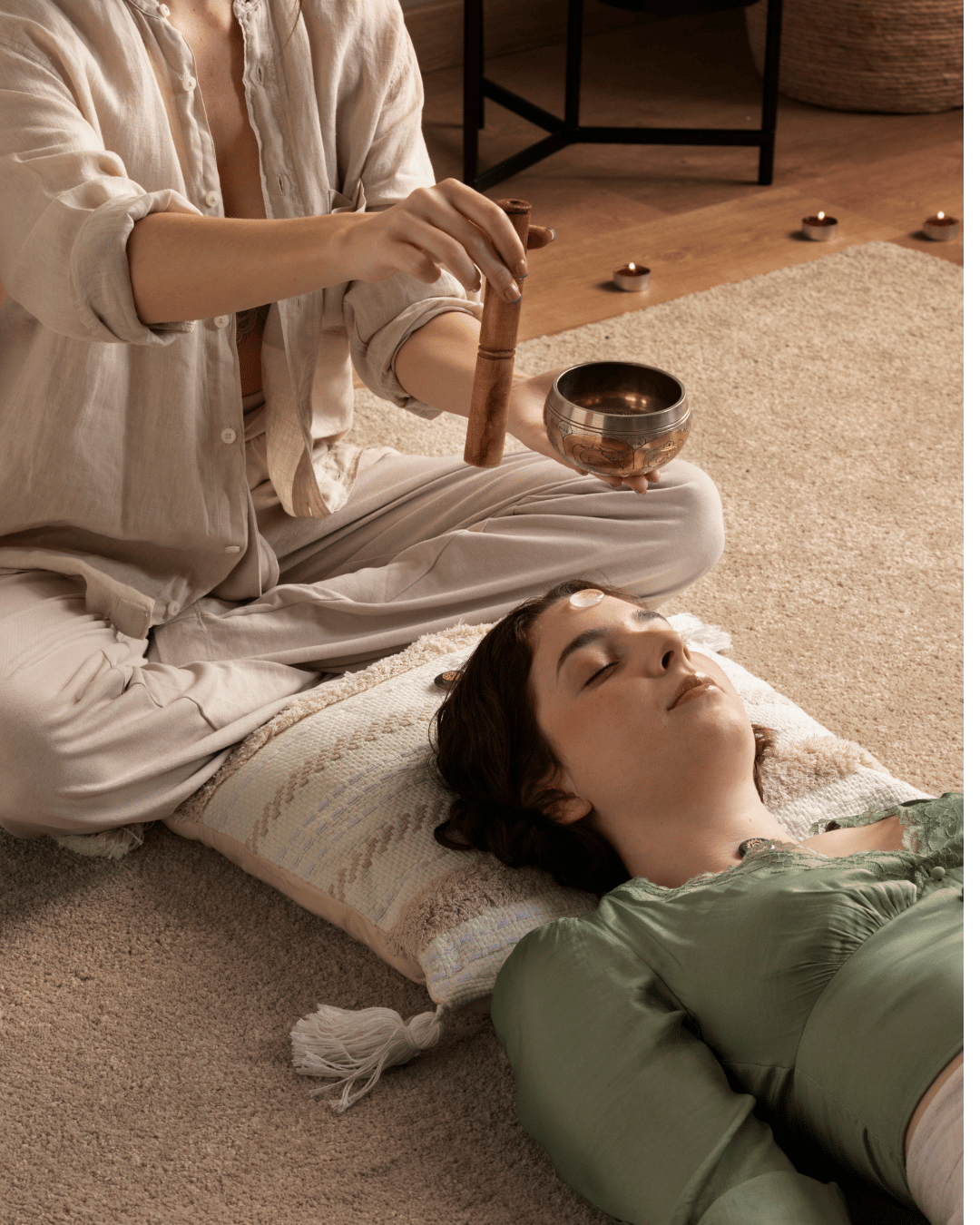 Limpeza e Alinhamento Vibracional (Terapia de Som) Segue-se a vibração profunda das Taças Tibetanas, Gongs e Diapasões, afinados com a sua partilha inicial. O som atua como um scanner vibracional que varre resistências mentais e físicas, limpando o ruído estático e alinhando o terreno para que as suas células entrem num estado de recetividade total.